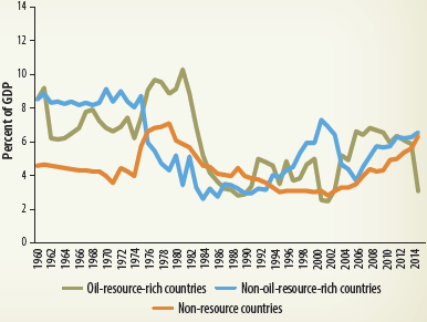 Focusing on averages for Sub-Saharan Africa masks the heterogeneity across country groups. Disaggregating the data by countries' resource abundance shows different trends and phases in public investment across country groups (figure 2.30). On average, in oil-rich countries, public investment has followed a rising path since the early 1990s. After reaching a peak of about 6.9 percent of GDP in 2006-08, public investment among oil-rich countries declined sharply, to 3.1 percent of GDP in 2015, partly due to lower commodity-based public revenues. For non-oil-resource-rich countries and non-resource countries, public investment has experienced a steady increase since 2006 (with a cumulative gain up to 2015 of about 2.8 and 2.9 percentage points of GDP, respectively).