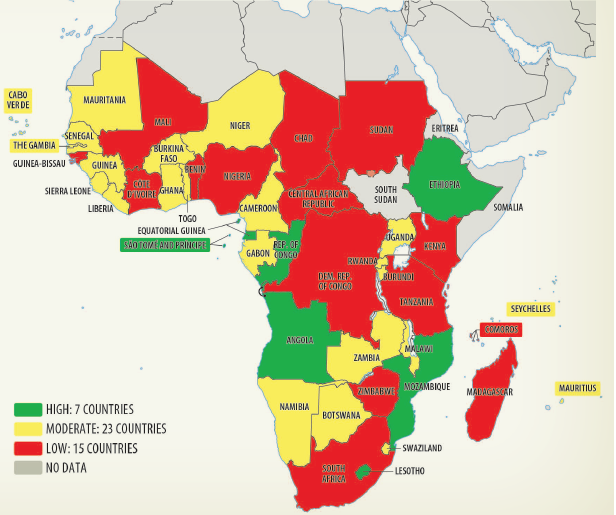 | Low-investment countries in the region have an average public investment of 3.1% of GDP. | MAP 2.1: Public Investment across countries in Sub-Saharan Africa (% GDP, average, 2011-15) | Map 2.1 depicts the cross-country heterogeneity in the distribution of public investment (as a percentage of GDP) in the Sub-Saharan Africa region. The figure classifies countries by their investment-output ratios as low (less than 5 percent of GDP), medium (between 5 and 10 percent of GDP), and high (more than 10 percent of GDP).11 Seven of 45 countries in the region have low investment, 23 have medium investment, and 15 have high investment. Low-investment countries in the region have an average public investment of 3.1 percent of GDP; medium-investment countries have an average of 6.8 percent; and high-investment countries have an average of 18.2 percent. The medium public investment group has the highest average private investment rate, at 15.1 percent of GDP, followed by the high and low public investment groups (12.4 and 10 percent, respectively). |
