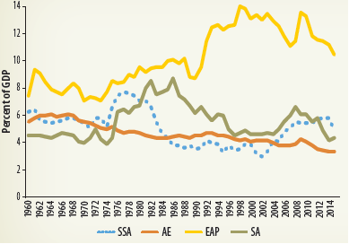 | Source: World Development Indicators, World Bank. Note: AE = advanced economies; EAP = East Asia and the Pacific; GDP = gross domestic; SA = south Asia; SSA = Sub-Saharan Africa. | Source: IMF Investment and Capital Stock Database. |