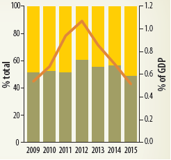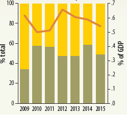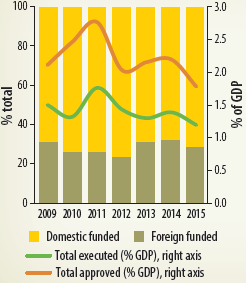Foreign aid continues to play an important role in some of the infrastructure subsectors. Although the share of the overall capital budget allocations funded through external aid decreased from 39 percent in 2009 to 36 percent in 2015, the distribution of this change was different across sectors. Road transport is the sector with the greatest share of domestic contribution, with the foreign funded share steadily accounting for around 30 percent of total allocations (figure 2.38, panel a).
