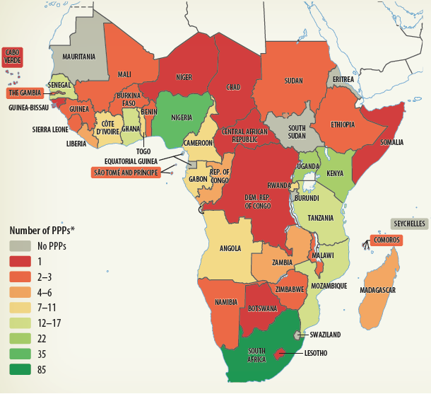 The most active countries in the region are South Africa (85 projects), Nigeria (35), Kenya (22), and Uganda (22) (map 2.2). Nine countries have only produced one PPP, and another 13 have produced only two or three in the past 25 years. The low number of PPPs in these countries can be attributed to the fact that some are small economies; others have been in conflict for several years; or they have weak legal and regulatory frameworks for procuring and implementing PPPs.