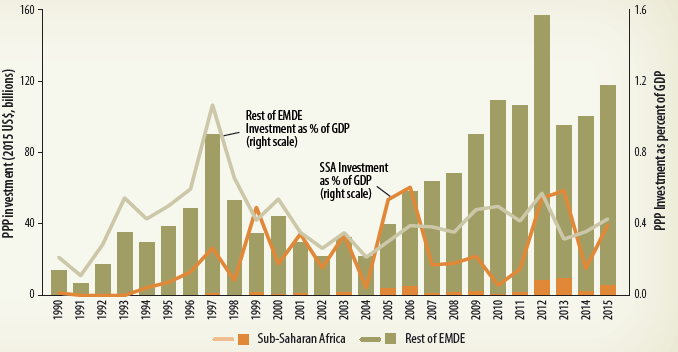 Source: World Bank PPI Database, February 7, 2017. *Note: % of GDP for rest of EMDE uses GDP for all countries except Sub-Saharan Africa. Data exclude telecom, divestitures, merchants, and management and lease contracts. |