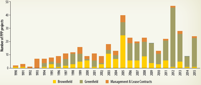 The PPI database identifies three types of PPP projects: management and lease contracts, greenfield projects, and brownfield projects. In the 1990s, as PPPs started to gain traction, management and lease contracts were the predominant type of PPP, likely due to their relative simplicity and ease of implementation. Brownfield projects gained popularity in the mid-1990s, peaking in 2005 and then subsequently declining, probably as existing assets that were eligible for PPPs were exhausted. Greenfield projects exhibit continued growth, as emphasis has been placed on renewable energy projects, which are largely responsible for the increase in greenfield projects in the most recent years, and particularly in 2012 (figure 2.45).