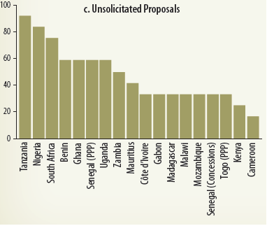 Empirical evidence suggests that a favorable regulatory and institutional framework corresponds with a successful PPP investment environment, despite limited data on the subject. One such gauge is the Benchmarking PPP Procurement (BPPP) report,37 which measures governments' capability to prepare, procure, and manage PPPs globally. The report also looks at the procedures for evaluating unsolicited proposals. The 2017 edition of the BPPP includes 20 of the 48 countries in Sub-Saharan Africa.38