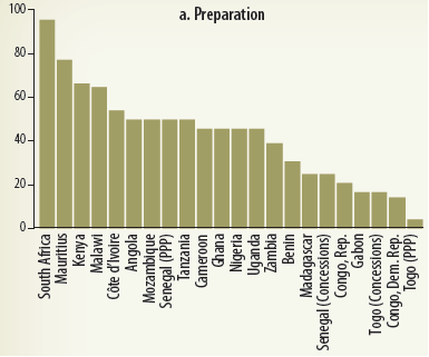 There are wide variations around unsolicited proposals, for which some countries have enacted comprehensive regulations (Tanzania, Nigeria, and South Africa), and others have regulations that are far from recognized good practice (Cameroon). Similarly, wide variations in scores appear around PPP project preparation, with some economies performing relatively well (South Africa and Mauritius), and others lagging (Togo and the Democratic Republic of Congo). South Africa has adopted comprehensive regulations on contract management, and scores very well in that area.