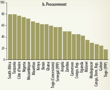 The average performance masks wide variation across countries. Procurement is the area where the economies obtained more similar and higher scores, indicating a more consistent and overall adequate performance (figure 2.51). However, even in this area there are outliers, such as the Democratic Republic of Congo, Gabon, and Togo (PPPs), which score significantly lower than the other economies in the region.