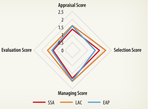 The score for Sub-Saharan Africa (1.53) is behind those of East Asia and the Pacific (1.59) and Latin America and the Caribbean (1.84).42 The score on project selection for Sub-Saharan Africa outperforms East Asia and the Pacific, but not Latin America and the Caribbean. Sub-Saharan Africa trails in the other three subcategories (project appraisal, managing, and evaluation). The performance of public investment management within the region varies by income level.43 The highest average PIMI index is achieved by UMCs (2.07), followed by low-income countries (LICs) (1.45) and LMCs (1.33). Although LICs and UMCs have comparable scores in project managing, LICs are outperformed by the two other country groups in the areas of project appraisal and evaluation.