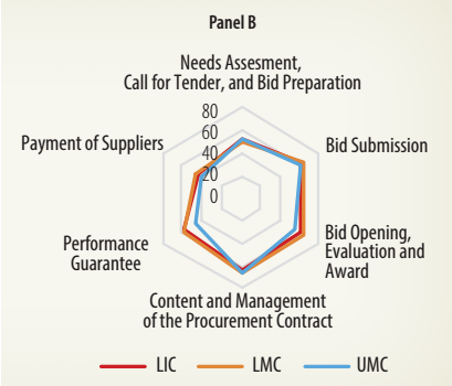 This subsection benchmarks aspects of public procurement. The procurement lifecycle of infrastructure projects covers the following dimensions: (a) needs assessment, call for tender, and bid preparation; (b) bid submission phase; (c) bid opening, evaluation, and awarding phase; (d) content and management of the procurement contract; (e) performance guarantee; and (f) payment of suppliers. The rationale and areas covered in these six stages of the procurement process are described in World Bank (2016a).