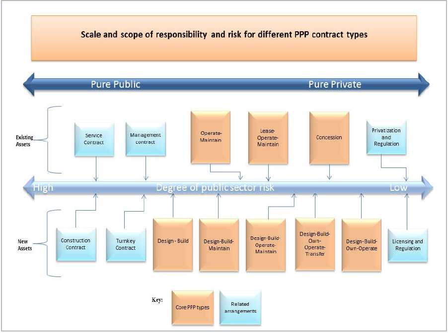 In practice, the definition of PPPs varies depending on the degree of ownership of assets and capital expenditure by the private partners. For example, in the case of management contracts, the private partners have very limited or no capital expenditure. On the other hand, in the case of a Design, Build, Own, Operate (BOOT) contract, the private partners are responsible for the design, building, operation and financing of a capital asset. In such a PPP, private partners receive payment from either the government (at regular intervals) or user charges, or both for delivering the services. Thus, there can be many variants of PPP schemes depending on the separation of asset ownership and risk-bearing between the public and private sector actors (Roehrich, et al. 2014). Figure 1 presents variations of PPPs in terms of distribution of responsibilities between the public and private sectors, asset ownership and the associated degree of public sector risk. It is important to note that the chart does not say anything about the relationship between different PPP contracts and their value for money (VfM), which will be discussed later. For example, while greater private sector responsibility will reduce public sector risk exposure by default, a badly designed PPP of any type can carry significant risks for the public in terms of reduced coverage, poor quality of service, or contingent fiscal liabilities. Figure 1 also proposes to distinguish between "core PPPs" and related arrangement. "Core attributes" for PPPs have the following characteristics (World Bank, 2012):