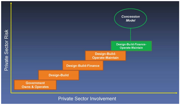 There are many different forms of P3s. Transportation P3 arrangements range from design-build procurements, where design and construction services are grouped into a single, fixed-price contract, to concessions, where a private investor/operator is responsible for financing, designing, constructing, operating, and maintaining new highway projects in exchange for the right to collect the revenues generated by the project or availability payments from the public sponsor for the duration of the concession period. As shown in Figure 2-1, the primary distinction between them is the specific responsibilities and level of risk that is assumed by the private partner.