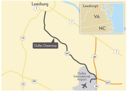 The Dulles Greenway is a six-lane, 14-mile, limited access toll highway in Loudon County, Virginia in suburban Washington, DC connecting Dulles International Airport with US 15 in Leesburg. It serves as an extension of the state-owned Dulles Toll Road (DTR), which connects Dulles Airport and other high-density employment centers in the corridor to the rest of the Washington metropolitan area. The two toll roads connect at a toll plaza, where drivers pay a single toll that is divided between the two operators. |