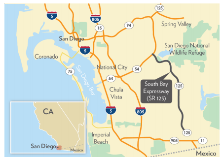 The South Bay Expressway (SBX) is a 12.5-mile, tolled extension of State Route 125 (SR 125) in San Diego County, CA, running from SR-54 southward to Otay Mesa, just north of the Mexican border. The SBX is the easternmost of the region's three north-south highway corridors and is located roughly 10 miles inland from the Pacific coast near the Laguna Mountains. The SBX also connects the only border crossing in the San Diego area serving commercial vehicles to the regional freeway network. |