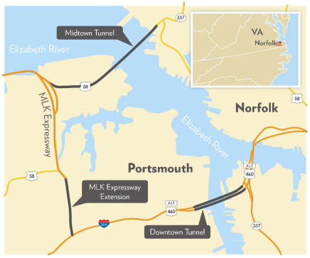 The $2.1 billion Downtown Tunnel/ Midtown Tunnel / Martin Luther King (MLK) Expressway Extension project is located in the cities of Portsmouth and Norfolk, in the Hampton Roads area of Virginia. This three- facility project involves transportation improvements to two tunnels and one expressway. The project includes: 1) building a new two-lane tolled Midtown Tunnel parallel to the existing Midtown Tunnel below the Elizabeth River connecting Norfolk and Portsmouth, together with modifications to both tunnel approaches to improve traffic flow; 2) rehabilitating and upgrading the existing Downtown Tunnel to comply with current fire and life safety standards; and 3) extending the MLK Expressway (Route 58) 0.8 mile to the south in Portsmouth to connect with I-264. |