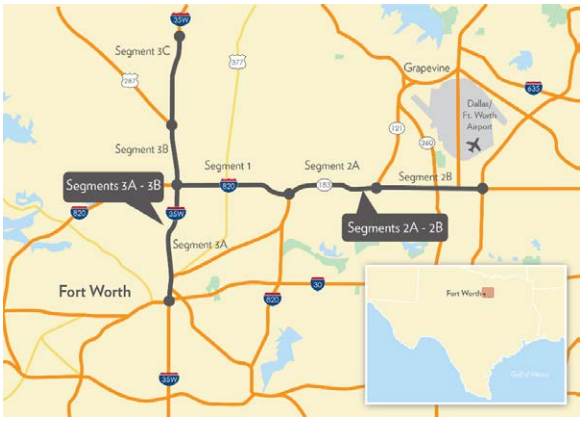 The project includes the reconstruction, widening, and addition of tolled managed lanes along 13.3 miles of roadway northeast of Fort Worth, Texas. Two tolled managed lanes were constructed in each direction together with new frontage roads on I-820 and SH 121/SH 183 extending east from Fort Worth toward Dallas-Fort Worth International Airport (DFW). By 2030, a third tolled managed lane will be added along SH 121/SH 183 and a third general purpose lane will also be constructed on I-820.