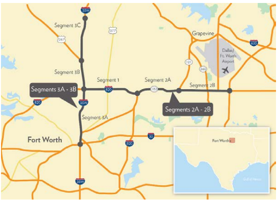 The 18-mile project includes the reconstruction, widening, and addition of tolled managed lanes along I-35W in three segments: the 6.5-mile Segment 3A from I-30 in downtown Fort Worth north to I-820; the 3.6-mile Segment 3B from I-820 north to U.S. 287, and the 8-mile Segment 3C from U.S. 287 north to Eagle Parkway near Fort Worth Alliance Airport. Two tolled managed lanes will be constructed in each direction on Segments 3A and 3B, while one tolled managed lane in each direction will be added to Segment 3C. In addition, one to two general purpose lanes and new frontage roads will be added to Segment 3A by 2030. On Segments 3B and 3C additional general purpose lanes, managed lanes, or frontage roads are also contemplated by 2030.