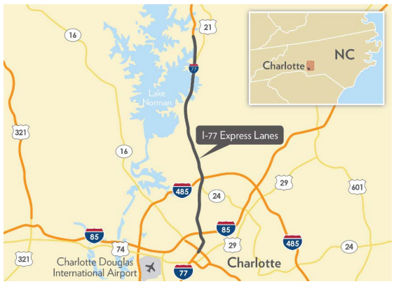 The $636 million I-77 Express Lanes will be a 26-mile, express toll lane facility in the median of I-77 extending through Charlotte, North Carolina and its northern suburbs. The project converts existing high-occupancy vehicle (HOV) lanes on I-77 to express lane operation and adds a second express lane in both directions on a 19-mile segment of I-77 between Downtown Charlotte (Exit 11) and West Catawba Avenue in Cornelius (Exit 28). From there, a single express lane will extend north for eight miles to Exit 36 in Mooresville in Iredell County. Motorcyclists, buses and carpoolers with three or more occupants will be able use the Express Lanes at no cost. Other vehicles will be charged tolls that vary in real time according to congestion levels in the corridor. |