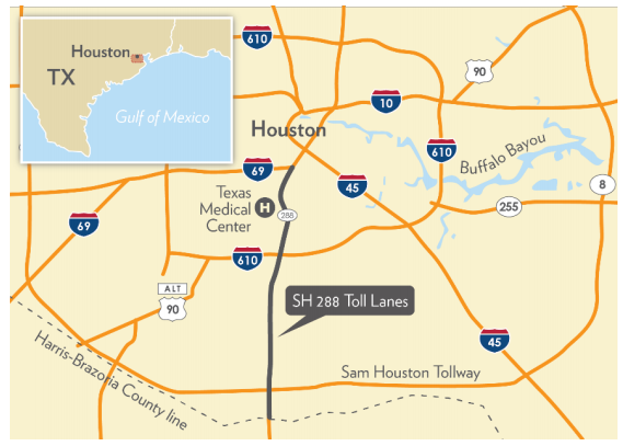 | The SH 288 Toll Lanes project in Harris County, Texas will add new toll lanes, general-purpose (untolled) lanes, and incorporate new connections and interchanges along 10.3 miles of State Highway (SH) 288 from US 59 (also designated I-69) near downtown Houston south to the Harris-Brazoria County line. The initial project configuration adds two toll lanes in each direction within the existing median, a new interchange with Beltway 8 (Sam Houston Parkway) that includes eight direct connector ramps to the toll lanes, interchange improvements with I-610 including direct connectors to the new toll lanes, and two direct connectors to the Texas Medical Center, located near the northern end of the corridor. |