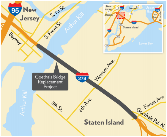 The $1.44 billion Goethals Bridge Replacement project involves the construction of a new dual-span bridge to replace the aging Goethals Bridge, which has been in service since 1928 and carries I-278 across the Arthur Kill channel between Staten Island, New York and Elizabeth, New Jersey. The bridge is owned and operated by the Port Authority of New York and New Jersey (Port Authority) and is one of three toll bridge crossings connecting Staten Island and New Jersey. |