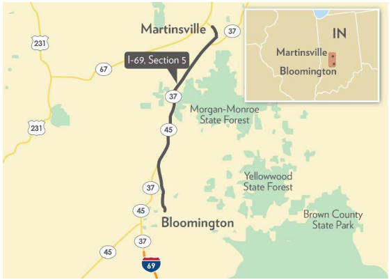 The I-69 Section 5 project will reconstruct and upgrade 21 miles of State Route 37 (an existing four-lane divided highway southwest of Indianapolis) between Bloomington and Martinsville, Indiana to full Interstate highway standards. The $466 million project includes four new interchanges and four new overpasses, in addition to improvements at existing interchanges and a third travel lane in each direction within urban areas along the corridor. |