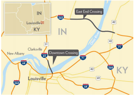 The East End Crossing is part of the larger $2.75 billion Ohio River Bridges project to augment highway capacity between Louisville and Southern Indiana. The Downtown Crossing portion of the project rehabilitates and adds a new span to the existing I-65 Kennedy Bridge in central Louisville, and reconstructs the Kennedy Interchange between I-65, I-64, and I-71 just south of the bridge. While each of the two projects includes road work in both states, Indiana is responsible for the entire East End Crossing project, while Kentucky is implementing the Downtown Crossing project.