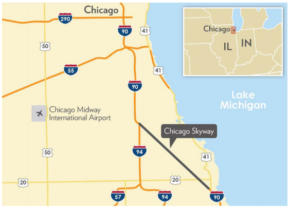 The Chicago Skyway is a 7.8-mile, six-lane toll road built in 1958 by the City of Chicago to connect the Dan Ryan Expressway (I-94) to the Indiana Toll Road (I-90). Owned by the City of Chicago, the facility includes a 3.5-mile elevated mainline structure crossing the Calumet River. The Chicago Department of Streets and Sanitation was responsible for maintaining the road and collecting tolls until a private consortium took control in January 2005. The agreement between the consortium, Skyway Concession Company, LLC, and the City of Chicago was the first long-term lease of an existing toll road in the United States. |