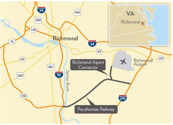 The Pocahontas Parkway (VA-895) is an 8.8-mile, four-lane, orbital toll road in southeast Richmond, Virginia connecting I-95 and the Chippenham Parkway to I-295. The Parkway also includes the 1.6-mile, four-lane Richmond Airport Connector, providing access to Richmond International Airport. The toll road was developed in 1998 by the Pocahontas Parkway Association, a nonprofit public benefit corporation created by the Virginia Department of Transportation (VDOT) to finance the project under regulations established by IRS Revenue Ruling 63-20. In June 2006, the road was leased for 99 years to Transurban, an Australian toll operator. Following several years of poor traffic and revenue, Transurban transferred its stake in the Parkway to its senior lenders in 2014. |