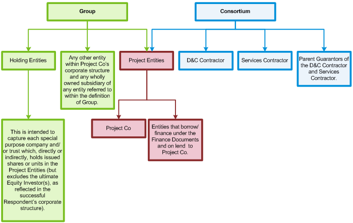 • Group: This definition will be tailored to reflect a Successful Respondent's corporate structure. It will include Project Co, any other Project Entity and each Holding Entity.