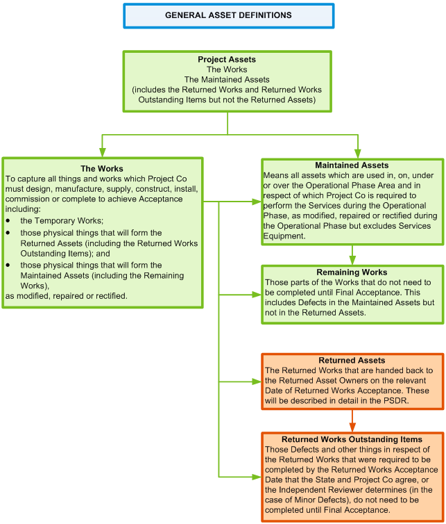 There are a number of categories of assets that are relevant to the Project. The tables and Diagram 2 below show the ownership of the assets (as between the State and Project Co), the interrelationship between the categories of assets and their relevance to each of the Development Phase and Operational Phase (where applicable).