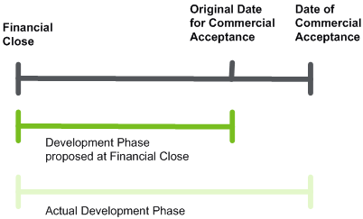 The length of the Development Phase will be competitively tendered as part of each Respondent's Proposal. The tendered period, being the period between an anticipated date for Financial Close and the Original Date for Commercial Acceptance, is then set out in the Contract Particulars at Contract Close and will be adjusted in accordance with the date on which Financial Close is actually achieved in accordance with the Financial Close Adjustment Protocols. The actual Development Phase is then the period between Financial Close and the Date of Commercial Acceptance and may therefore be longer or shorter than the period initially proposed, depending on whether Commercial Acceptance is achieved before (in circumstances where early Commercial Acceptance is permitted - see section 2.25.4.3) or after the Original Date for Commercial Acceptance. The Date for Commercial Acceptance may be extended for Extension Events under the Project Deed (see section 2.5.1.2 for further discussion). The Date of Commercial Acceptance may occur after the Date for Commercial Acceptance where Project Co is delayed in achieving Commercial Acceptance by the Date for Commercial Acceptance and is not entitled to an extension to the Date for Commercial Acceptance under the Project Deed.