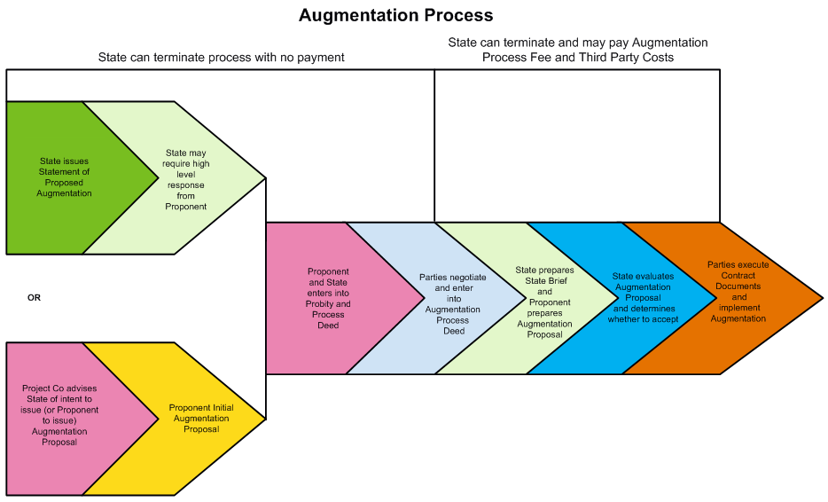 If the State decides to further progress an Augmentation, the Proponent will enter into an Augmentation Process Deed which will set out the parties' rights and obligations in respect of the development of a fully detailed Augmentation Proposal. Part 2 of the Augmentation Process Schedule sets out the principles on which the Augmentation Process Deed will be prepared. These include the principles for, amongst other things, payment during the Augmentation Process, Milestones, pricing and funding for the Augmentation, contractual models, tender processes, termination of the Augmentation Process, intellectual property rights, preparation of the State Brief for the Augmentation and preparation of the detailed Augmentation Proposal. The process culminates in the evaluation of the Final Augmentation Proposal by the State.