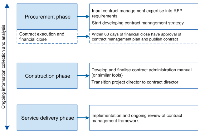 Developing and implementing a contract management strategy for a Partnerships Victoria project can be a complex task requiring significant resources. However, completing this task early has significant benefits, as effective contract management assists the government party to achieve the value for money and project outcomes agreed upfront in the project deed.