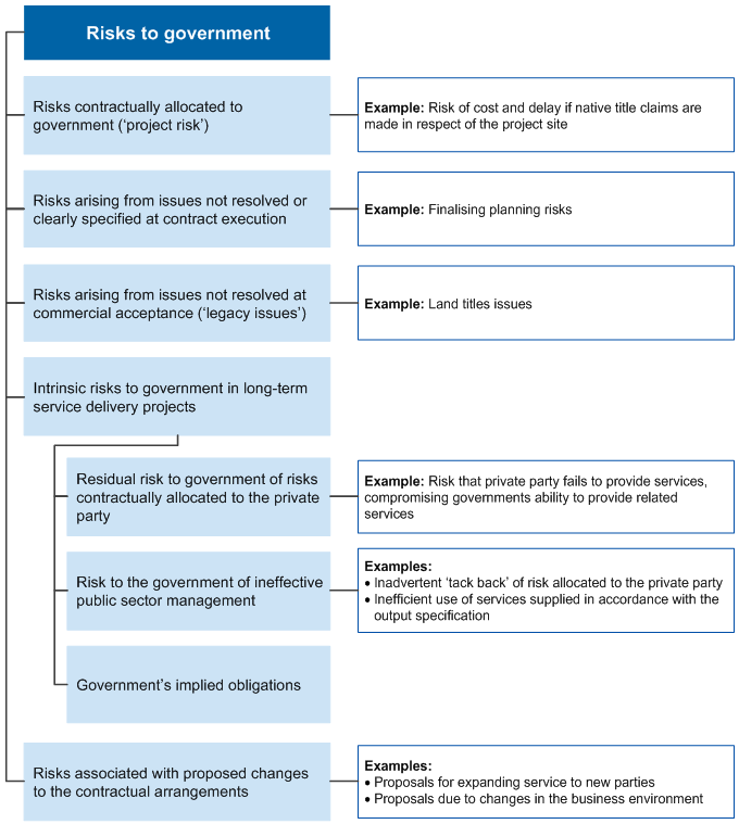 Contract management includes thorough information collection, analysis and review. New and emerging risks through the project lifecycle must be identified and control actions taken. Figure 2.1 outlines some key government retained risks that require contract management strategies.