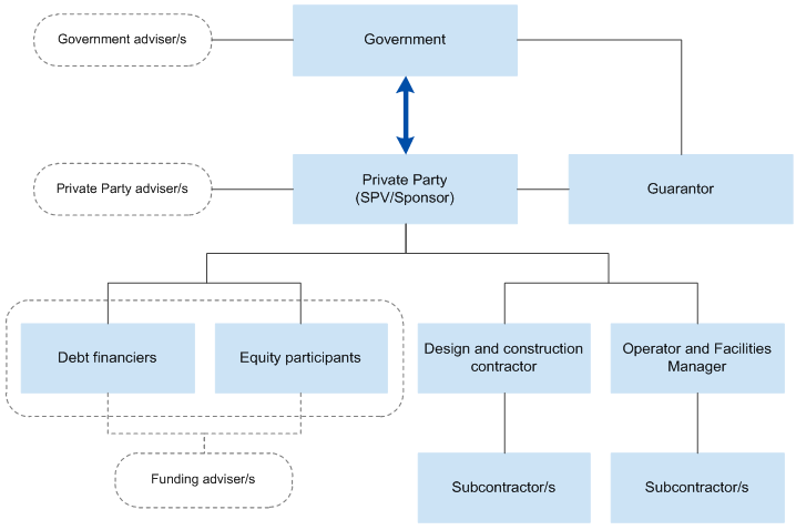 Typically, the private party will comprise a consortium of debt financiers, equity investors, a builder, a facility management subcontractor and potentially an operator (in projects where the operations have been outsourced to the private sector). Figure 2.2 shows a typical consortium and its relationship with the government party. In most projects, the consortium forms a special purpose vehicle specifically for the purposes of the PPP project. This special purpose vehicle enters into the project deed with the government party and is referred to as the private party.