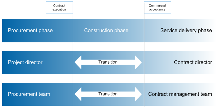 Figure 3.1 below shows how the transition of responsibility for management of the contract generally occurs on projects from the procurement phase to the service delivery phase.