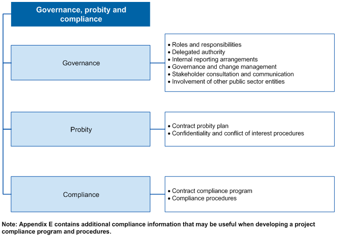 Appropriate project governance, probity and compliance arrangements are fundamental to good contract management. Good governance is important for dealings with the private party and internally within government. The contract management team must conduct itself and its dealings in a way that is consistent with acceptable probity principles, as well as ensuring the private party complies with relevant laws, regulation and government policies.