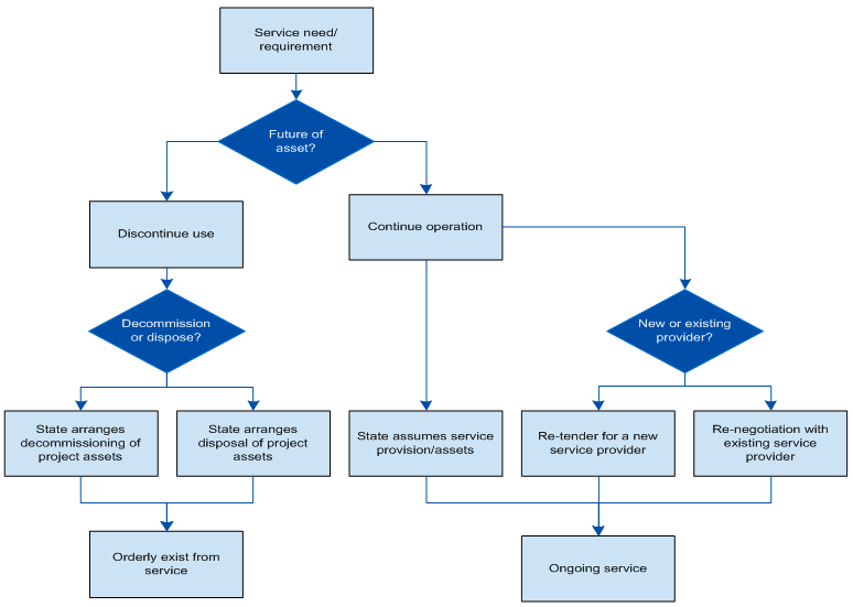 Once a future service need that aligns with both departmental and government policy has been confirmed by Cabinet, the end of term arrangements for the existing project need to be managed within the context of phase 2 of the Investment lifecycle and high-value, high-risk, guidelines. This requires preparing a full business case which assesses project options (based on the preferred strategic option of phase 1), and recommends a preferred project solution and procurement method, and identifying likely costs, risks, stakeholder plans and resourcing for implementation.