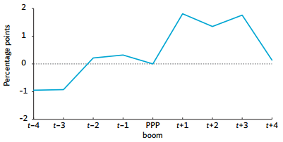 Here, we see that an investment boom-PPP investment (% of GDP) grows for 3 consecutive years-is associated with higher growth. Figure 2.5 shows how real GDP growth per capita is higher after an investment boom relative to the period before it. The positive relationship between PPPs and economic growth could be attributed to the huge capital involved in these projects. Shediac et al. (2008) note that large infrastructure projects generate employment in the short and long term, and crowd in private investment. But the corresponding growth impact in this analysis is rather short-lived. The difference in economic growth reaches more than 2%, but stabilizes 4 years later. Even so, this does not cast doubt on the long-term growth impacts of PPPs, given the expected productivity improvements associated with better infrastructure.
