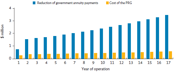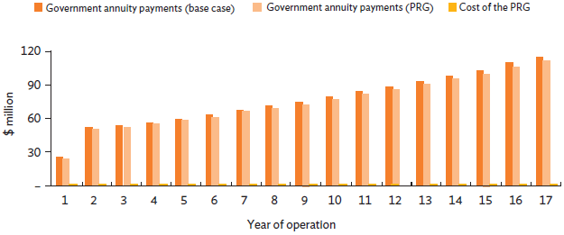 As Figure 7.5 shows, there is clearly an effective reduction in government annuity payments. The payments are higher under the base-case scenario relative to an MDB's partial risk guarantee. Figure 7.6 shows the reduction totaled $40 million, but it is associated with the total cost of the sovereign partial risk guarantee, amounting to $7.2 million during the years of operation. This cost is calculated based on ADB's published figures of a guarantee fee of 50 basis points and a commitment fee of 15 basis points. Thus, under the guarantee terms, a government could save $32.8 million (approximately 13% of the capital expenditure) from a project, which could lead to increased social benefits by allocating these savings to equally important public services. This example is illustrative and real savings can only be demonstrated by actually seeing the results of the tendering.