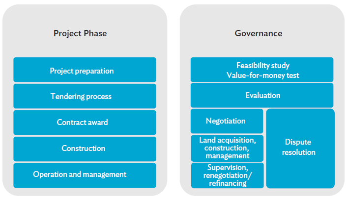 Good governance is needed for all phases of a PPP project's life cycle, and its lack in any one of these phases may result in a project failing. Figure 8.2 shows the major steps for the governance of PPPs at key project phases. The following section briefly looks at how governance issues affected a couple of high-profile infrastructure PPPs in the Republic of Korea at certain project phases.