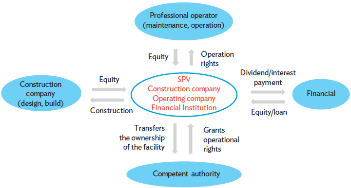 A special purpose vehicle (SPV), a legal entity that acts as the concessionaire, needs to be established to implement a PPP project in the Republic of Korea. SPVs are generally made up of construction companies, financial investors, and professional operators who recover their investment from profits on construction, dividends, or interest payments. After being set up, an SPV needs authorization from the competent authority-the procurement agency-to initiate a design-build-finance-operate process.