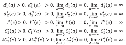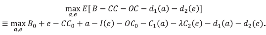 Equations (5) and (6) show the first-order conditions for a and e. Equation (5) implies the marginal costs of decreasing CC should be the same as the marginal benefit of decreasing CC. When C increases the effort, a, both the disutility of C and the operating cost increase. Thus, the marginal social cost that includes the marginal OC and the marginal disutility of C (the left side of the equation) should be the same as the marginal benefit, which is 1, in social optimum.