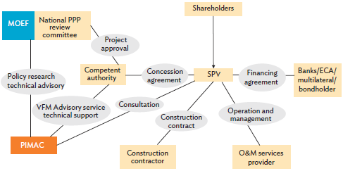 ECA = export credit agency, MOEF = Ministry of Economy and Finance, O&M = operation and maintenance, PIMAC = Private Infrastructure Investment Management Center, PPP = public-private partnership, SPV = special purpose vehicle, VFM = value for money.