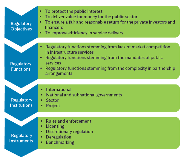 Figure 10.2 shows the main components of a regulatory system for PPPs in infrastructure services. Although these systems aim to protect against PPP risks, they carry their own regulatory risks. A poorly designed or functioning regulatory framework can expose the system to additional risks, while contributing little to mitigating the very risks that it is designed to counter. The framework shown in the figure provides a diagnostic tool for identifying pitfalls in designing regulatory systems that can help avoid these risks.