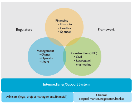Financing infrastructure is the most challenging part of infrastructure development in Southeast Asia and other emerging regions. Public finance can offer several mechanisms to support PPP projects, such as viability gap funding, tax allowances, and revenue and loan guarantees. To avoid breaching good governance principles, these mechanisms are determined by regulations, typically benchmarked to international standards. A private sector partner who awarded a PPP project will need to raise funds by using equity and making loans to maximize financial returns. This demand is filled by financial providers, such as equity firms, investment banks, creditors, and sponsors.