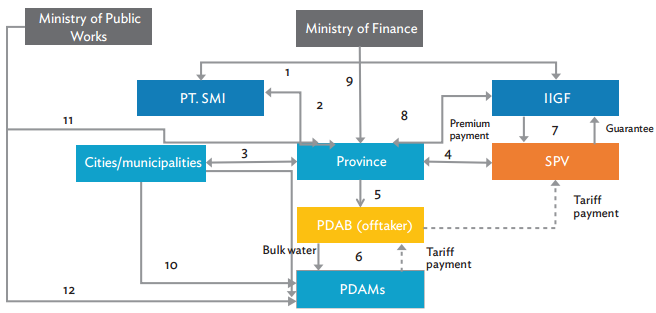 IIGF = Indonesia Infrastructure Guarantee Fund, PDAB = Perusahaan Daerah Air Bersih (regional bulk water company), PDAM = Perusahaan Daerah Air Minum (local water company), PT SMI = Sarana Multi Infrastruktur, SPV = special purpose vehicle.