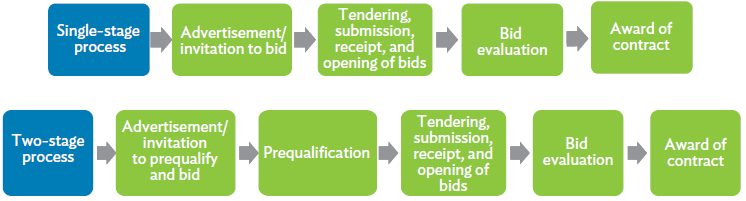 The approval of these oversight bodies is a prerequisite to government budget support for PPP projects and for the project tender itself. Competitive bidding is the default mode for project procurement and awarding contracts in the Philippines. Negotiated contracts are allowed if there is only one complying bidder in a competitive bid, but these are restricted to the financial proposal. The head of the implementing agency is authorized to sign the contract after it has been reviewed by the agency's legal counsel. Department of Finance approval is needed for projects in which the national government has direct and contingent liability. Figure 12.1 shows the procurement process options for solicited PPP proposals.