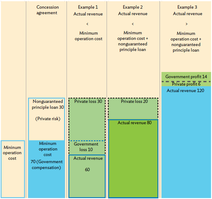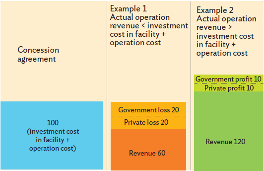 can receive a certain portion of the operating costs from the government when user demand for the infrastructure facility or service is not sufficient (example 1 in Figure 12.3). But, when demand exceeds the contracted forecast, the government receives a partial return of the private partner's profits (example 2). BTO risk-sharing was introduced to supplement the previous system in which the private sector took on most of the project risk for a BTO, and the government took on most of the risk for a BTL. The fundamental concept of a BTO risk-sharing project is that the competent authority shares a portion of the private sector's investment risk rather than the revenue risk. Under this scheme, private partners bear less revenue risk, compared with standard BTO scheme. This is a way of lowering the rate of return on the government's investment and, ultimately, to lower the user fees.