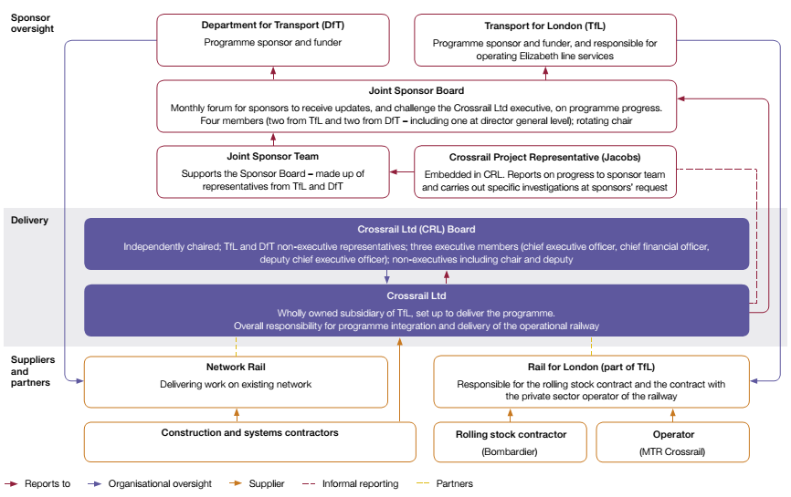 1.6 The Department for Transport (the Department) and Transport for London (TfL) jointly sponsor and oversee the Crossrail programme. Crossrail Ltd is a company wholly owned by TfL and is responsible for delivering the programme safely to cost and schedule. The project development agreement sets out sponsors' high-level requirements for Crossrail, such as service frequency and service levels, as well as the programme's governance and delivery structure (see Figure 2).