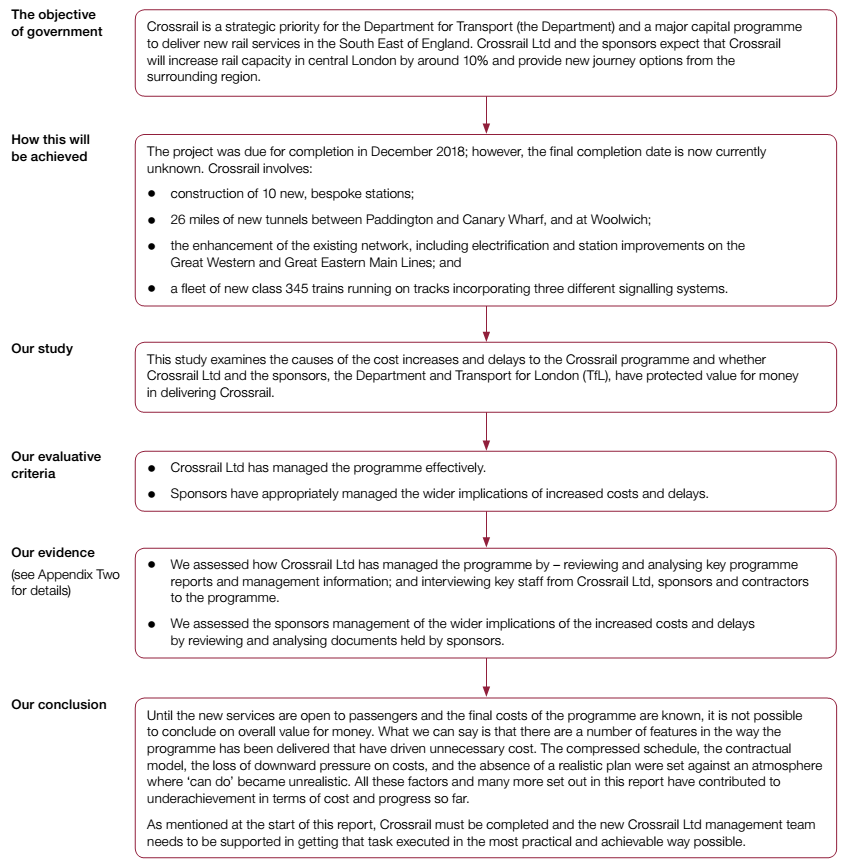 1 This study examines the causes of the cost increases and delays to the Crossrail programme and whether Crossrail Ltd and the sponsors (the Department for Transport (the Department), and Transport for London (TfL)), have protected value for money in delivering Crossrail. The key areas we reviewed were: