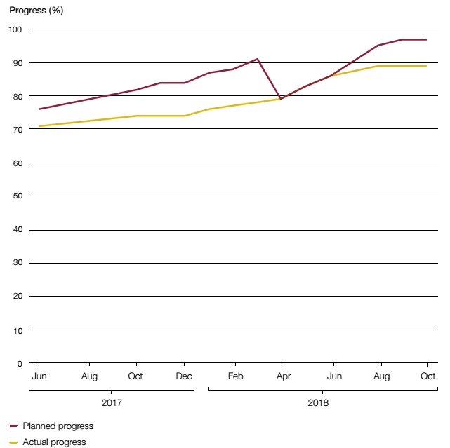 1 The dips in the planned progress line reflect the rebasing of the programme plan when Crossrail Ltd revised the Master Operational Handover Schedule (MOHS).